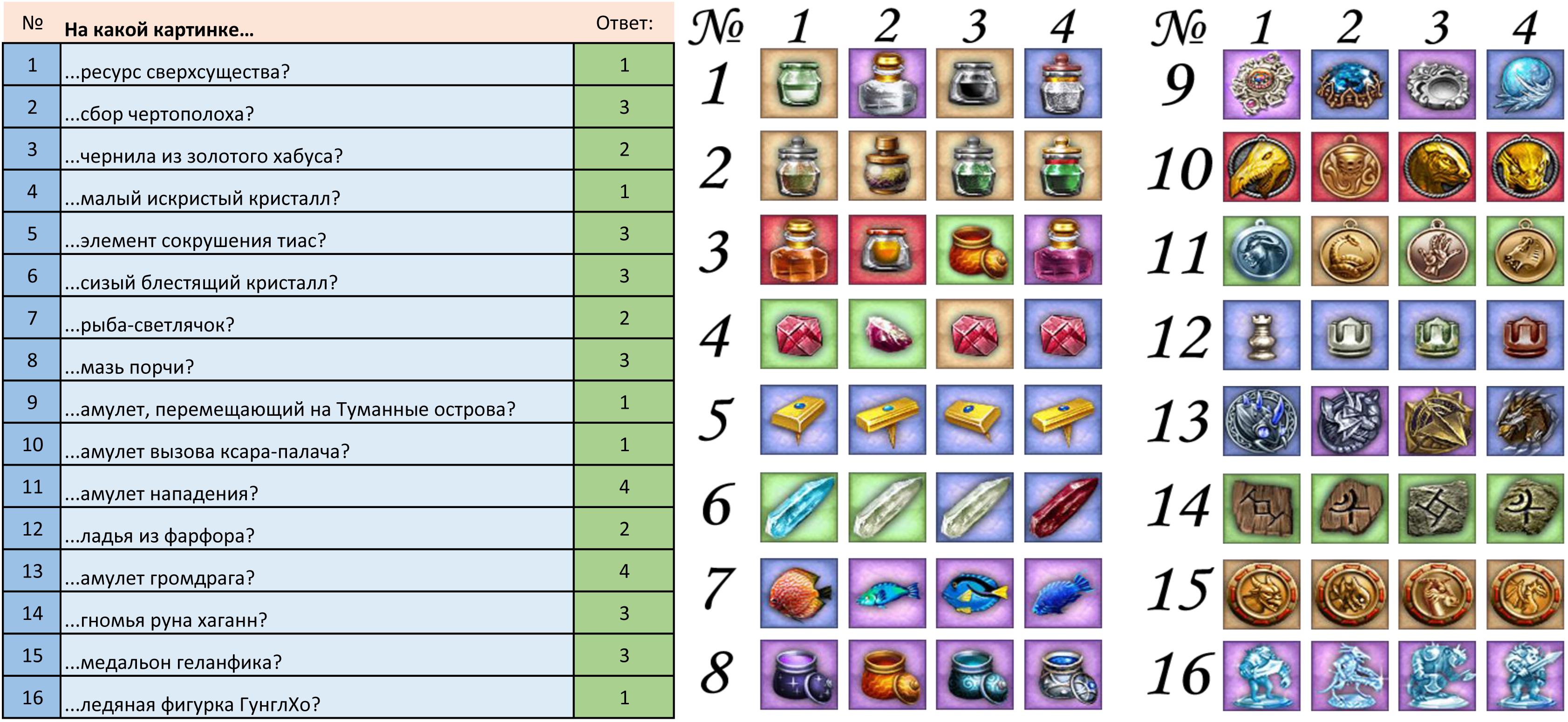 2. Числа слева от групп изображений - номера соответствующих вопросов.